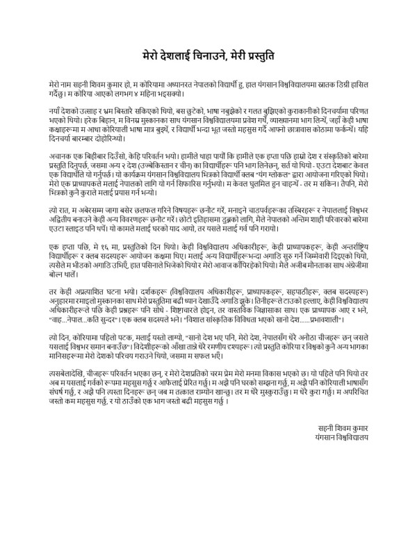 त्यो दिन, कोरियामा पहिलो पटक, मलाई यस्तो लाग्यो, "सानो देश भए पनि, मेरो देश, नेपालसँग धेरै अनौठा चीजहरू छन् जसले यसलाई विश्वभर समान बनाउँछ"। विदेशीहरूको आँखा तान्ने धेरै रमणीय दृश्यहरू। त्यो प्रस्तुति कोरिया र विश्वको कुनै अन्य भागका मानिसहरूमा मेरो देशको परिचय गराउने थियो, जसमा म सफल भएँ।